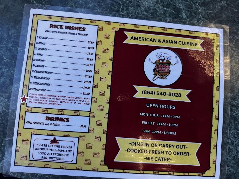 Welcome to Arden's Burger & Grill, your ultimate dining destination in Anderson, SC! Located at 3319 N Main St, we specialize in a delightful fusion of Asian cuisine and classic American burgers. Enjoy a casual and trendy atmosphere perfect for lunch, dinner, or a solo meal. Our menu features simple yet exquisite dishes, including mouth-watering chicken sandwiches and savory noodles. We offer convenient services like delivery, takeout, and dine-in, along with accessible seating and parking for everyone. With a kid-friendly menu and a commitment to quality, Arden's Burger & Grill is the perfect spot for families, students, and tourists alike.